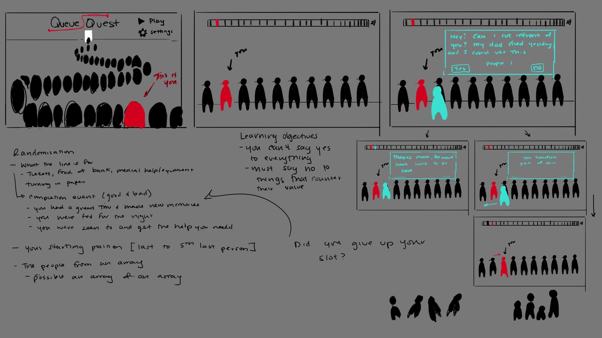 - NPCs periodically ask to cut ahead. They come with a backstory and a request (1–5 people).